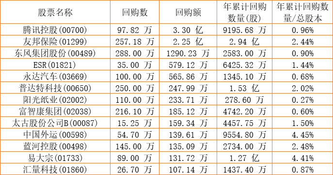 和谐汽车(03836)、新鸿基公司(00086)、清科创业(01945)、天福(06868)、富智康集团(02038)、腾讯控股(00700)、太古股份公司B(00087)、亿都(国际控股)(00259)、兴胜创建(00896)、彩星集团(00635)、东风集团股份(00489)、天伦燃气(01600)、中国外运(00598)、普达特科技(00650)、蓝河控股(00498)、瑞声科技(02018)、民银资本(01141)、阳光纸业(02002)、汇量科技(01860)、移卡(09923)、ESR(01821)、易大宗(01733)、友邦保险(01299)、永达汽车(03669)、康圣环球(09960)于2023年1月3日进行了回购。其中,回购金额最大的为腾讯控股(00700),回购数量97.82 万,回购金额3.30 亿元。