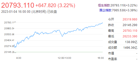 港股2023年第二个交易日走强明显,三大指数皆呈高开高走行情,恒指涨3.22%上扬647点,国指涨3.39%,恒生科技指数更是大涨4.58%,三者皆刷新阶段新高。港股后市展望,国信证券认为,港股2023年1月的回调幅度有限。总的来说,国信证券认为,港股1季度依然保持强势。尽管经历了去年11月12月的大涨,但他们认为港股的回调幅度将有限,原因是:1、基钦周期转扩张;2、互联网企业ROE环比已经明显改善;3、政策方面包括疫情防控、互联网、房地产、教育对市场都更加有利。该机构建议以超跌三板块(互联网、医药、地产/金融),以及大消费作为重点,同时适度布局新能源运营商、电子、汽车等前期滞涨的方向;具体来说,国信推荐恒生科技板块中的本地生活、SAAS/软件、游戏、短视频、互联网旅游、电商、医药电商;它们2022年跌幅大,尚有不错的修复空间