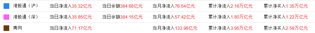 今日,南下资金净流入71.17亿港元,其中港股通(沪)净流入35.32亿港元,港股通(深)净流入35.85港元。