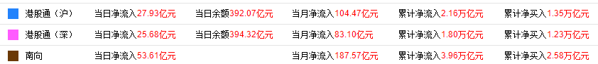 今日,南下资金净流入53.60亿港元,其中港股通(沪)净流入27.93亿港元,港股通(深)净流入25.67港元。