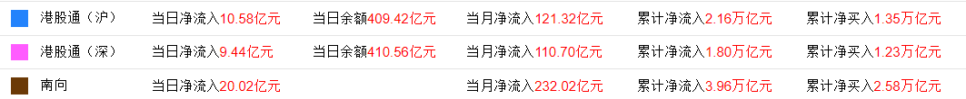 今日,南下资金净流入20.01亿港元,其中港股通(沪)净流入10.58亿港元,港股通(深)净流入9.43亿港元。