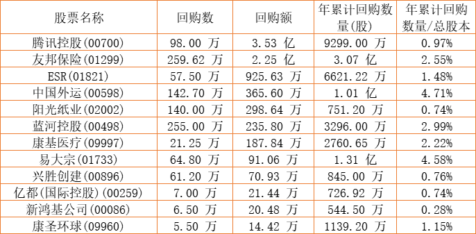 和谐汽车(03836)、亿都(国际控股)(00259)、清科创业(01945)、兴胜创建(00896)、友邦保险(01299)、腾讯控股(00700)、中国外运(00598)、蓝河控股(00498)、阳光纸业(02002)、新鸿基公司(00086)、易大宗(01733)、康圣环球(09960)、ESR(01821)、康基医疗(09997)于2023年1月10日进行了回购。其中,回购金额最大的为腾讯控股(00700),回购数量98.00 万,回购金额3.53 亿元。