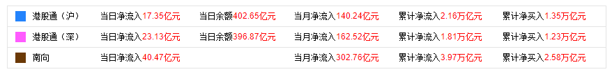 今日,南下资金净流入40.47亿港元,其中港股通(沪)净流出17.35亿港元,港股通(深)净流入23.13亿港元。