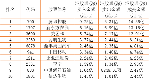 港股通(深)买卖前十股(单位:港元):