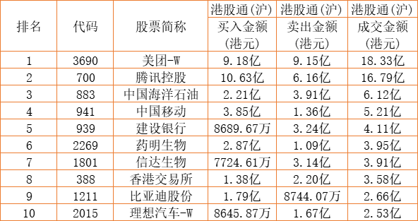 港股通(沪)买卖前十股(单位:港元):