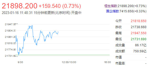 1月16日午间,港股指数上涨,香港恒生指数涨0.73%,恒生科技指数涨0.14%。