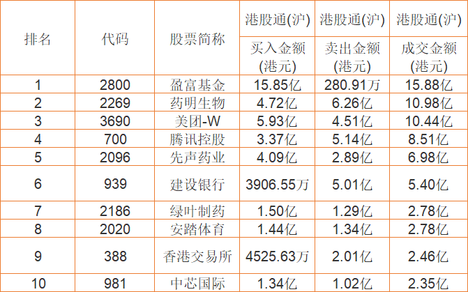 港股通(沪)买卖前十股(单位:港元):