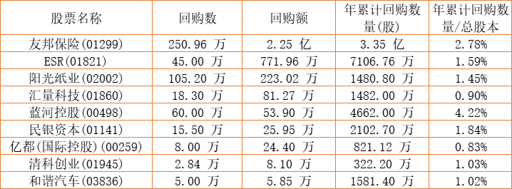 阳光纸业(02002)、亿都(国际控股)(00259)、友邦保险(01299)、蓝河控股(00498)、民银资本(01141)、和谐汽车(03836)、清科创业(01945)、汇量科技(01860)、ESR(01821)于2023年1月30日进行了回购。其中,回购金额最大的为友邦保险(01299),回购数量250.96 万,回购金额2.25 亿元。