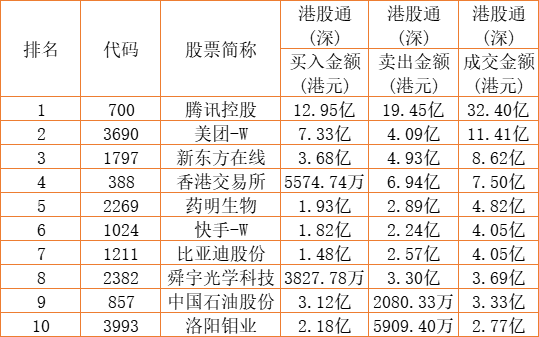 港股通(深)买卖前十股(单位:港元):