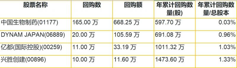 中国生物制药(01177)、DYNAM JAPAN(06889)、亿都(国际控股)(00259)、兴胜创建(00896)于2023年2月28日进行了回购。其中,回购金额最大的为中国生物制药(01177),回购数量165.00 万,回购金额668.25 万元。