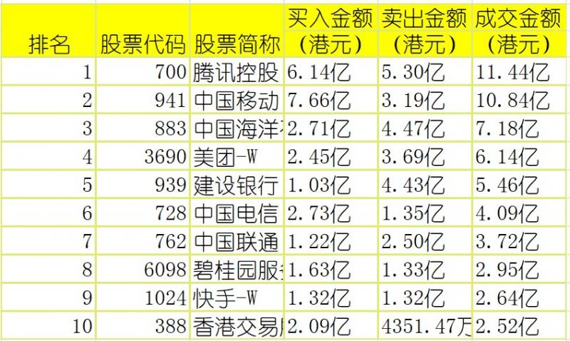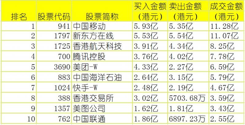 亚汇网实时数据统计:截至3月6日收盘,腾讯控股、中国移动、中国海洋石油(沪)成交前三,中国移动、新东方在线、香港航天科技(深)成交前三。