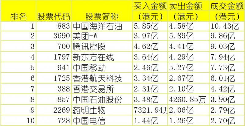 亚汇网3月7日港股通数据统计显示:中国海洋石油成交额居首,达10.43亿港元