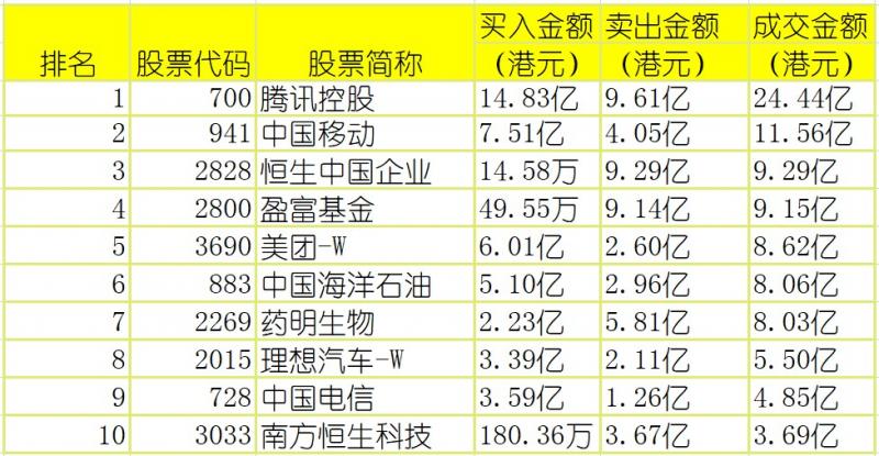 亚汇网实时数据统计:截至3月13日收盘,腾讯控股、中国移动、盈富基金(沪)成交前三,腾讯控股、中国移动、恒生中国企业(深)成交前三。