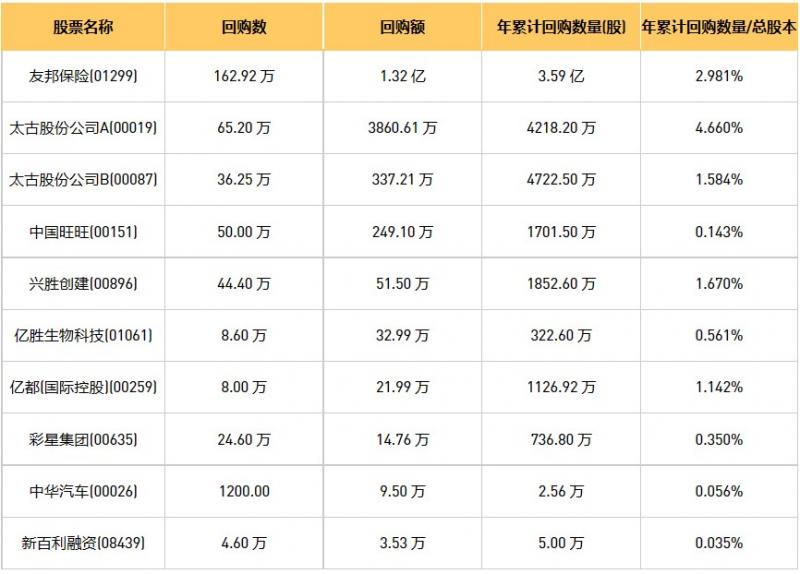 彩星集团(00635)、新百利融资(08439)、兴胜创建(00896)、中国旺旺(00151)、友邦保险(01299)、中华汽车(00026)、亿胜生物科技(01061)、亿都(国际控股)(00259)、太古股份公司A(00019)、太古股份公司B(00087)于2023年3月14日进行了回购。其中,回购金额最大的为友邦保险(01299),回购数量162.92 万,回购金额1.32 亿元。