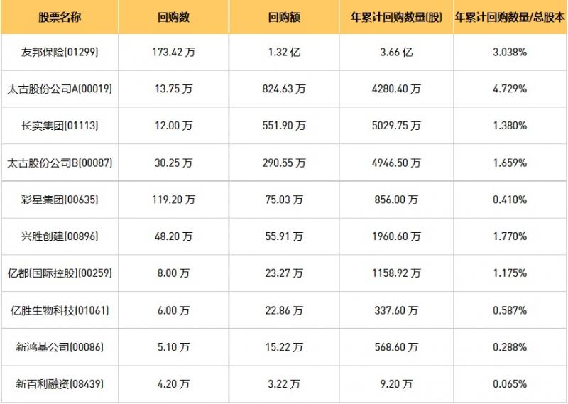 彩星集团(00635)、新百利融资(08439)、亿胜生物科技(01061)、长实集团(01113)、兴胜创建(00896)、新鸿基公司(00086)、友邦保险(01299)、太古股份公司A(00019)、太古股份公司B(00087)、亿都(国际控股)(00259)于2023年3月20日进行了回购。其中,回购金额最大的为友邦保险(01299),回购数量173.42 万,回购金额1.32 亿元。