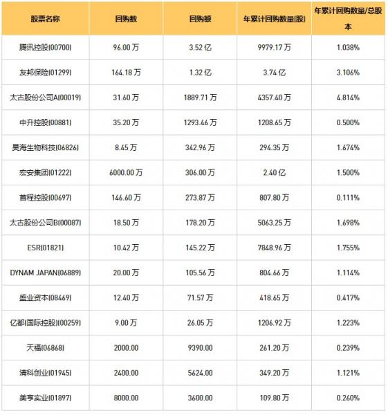 天福(06868)、DYNAM JAPAN(06889)、宏安集团(01222)、亿都(国际控股)(00259)、腾讯控股(00700)、太古股份公司A(00019)、太古股份公司B(00087)、首程控股(00697)、昊海生物科技(06826)、友邦保险(01299)、盛业资本(08469)、清科创业(01945)、美亨实业(01897)、中升控股(00881)、ESR(01821)于2023年3月27日进行了回购。其中,回购金额最大的为腾讯控股(00700),回购数量96.00 万,回购金额3.52 亿元。