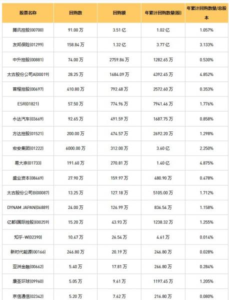 亚洲金融(00662)、DYNAM JAPAN(06889)、彩星集团(00635)、天福(06868)、首程控股(00697)、宏安集团(01222)、清科创业(01945)、亿都(国际控股)(00259)、新时代能源(00166)、太古股份公司A(00019)、太古股份公司B(00087)、腾讯控股(00700)、京信通信(02342)、盛业资本(08469)、友邦保险(01299)、易大宗(01733)、乐声电子(00213)、康圣环球(09960)、ESR(01821)、方达控股(01521)、中升控股(00881)、永达汽车(03669)、知乎-W(02390)于2023年3月29日进行了回购。其中,回购金额最大的为腾讯控股(00700),回购数量91.00 万,回购金额3.51 亿元。