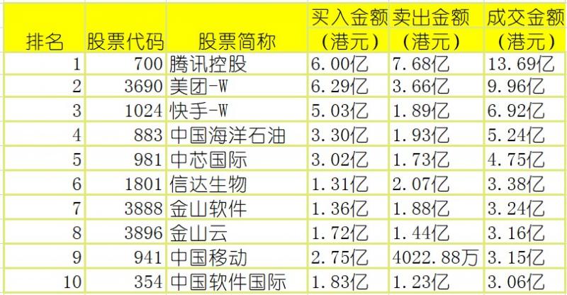 港股通(沪)买卖前十股(单位:港元):