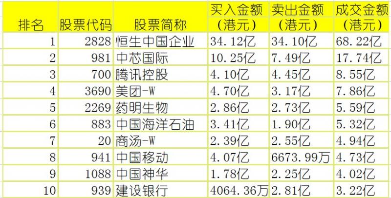 亚汇网实时数据统计:截至4月14收盘,恒生中国企业、中芯国际、腾讯控股(沪)成交前三,中芯国际、腾讯控股、美团—W(深)成交前三。