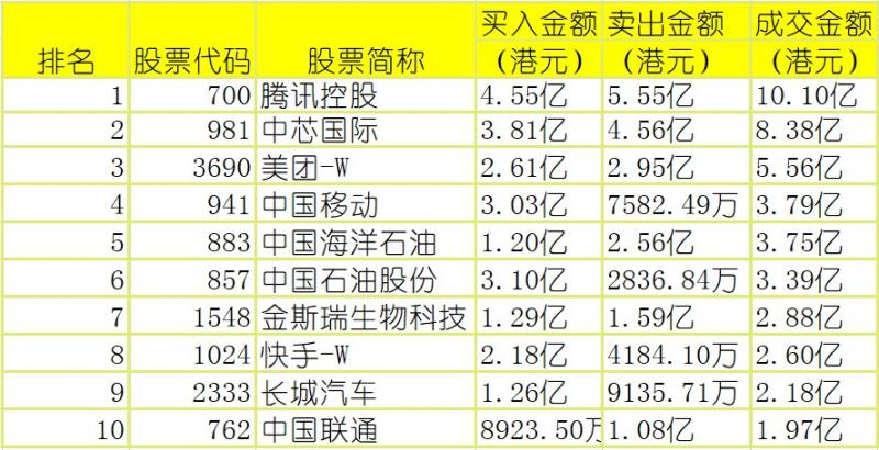 亚汇网4月24日港股通数据统计显示:腾讯控股成交额居首,达10.10亿港元