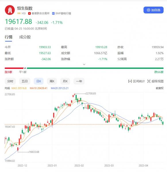 香港恒生指数开盘跌0.28%,全天震荡走弱。截至收盘,恒生指数跌1.71%或342.06点,报19617.88点,全日成交额1066.57亿港元;恒生国企指数跌1.96%,报6601.36点;恒生科技指数跌3.46%,报3824.09点。