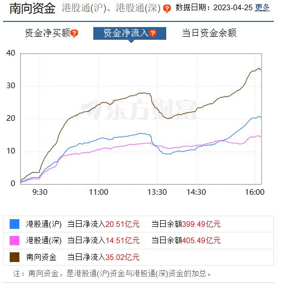 截至4月25日港股收盘,南向资金全日合计净流入逾35.02亿港元。其中,沪市港股通净流入20.51亿港元,深市港股通净流入14.51亿港元。