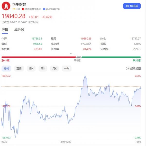 香港恒生指数开盘跌0.11%,全天呈窄幅震荡走势。截至收盘,恒生指数涨0.42%或83.01点,报19840.28点,全日成交额970.88亿港元;恒生国企指数涨0.32%,报6675.4点;恒生科技指数跌0.26%,报3861.98点。