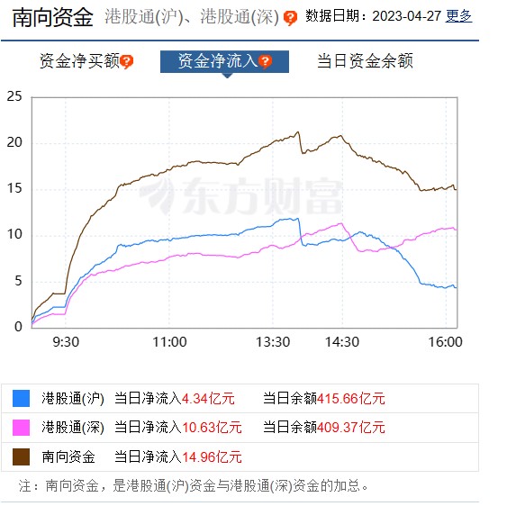 截至4月26日港股收盘,南向资金全日合计净流入逾14.96亿港元。其中,沪市港股通净流入4.34亿港元,深市港股通净流入10.63亿港元。