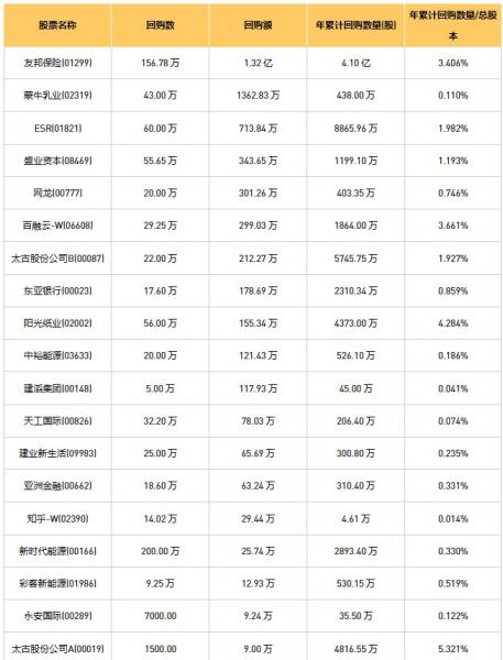 永安国际(00289)、建滔集团(00148)、亚洲金融(00662)、东亚银行(00023)、天福(06868)、新时代能源(00166)、蒙牛乳业(02319)、盛业资本(08469)、中裕能源(03633)、太古股份公司A(00019)、太古股份公司B(00087)、百融云-W(06608)、建业新生活(09983)、天工国际(00826)、乐声电子(00213)、阳光纸业(02002)、友邦保险(01299)、创胜集团-B(06628)、网龙(00777)、ESR(01821)、彩客新能源(01986)、康圣环球(09960)、知乎-W(02390)于2023年5月3日进行了回购。其中,回购金额最大的为友邦保险(01299),回购数量156.78 万,回购金额1.32 亿元。