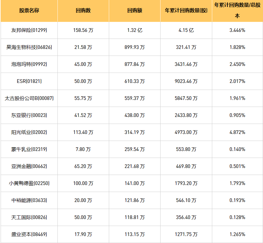 永安国际(00289)、天福(06868)、东亚银行(00023)、亚洲金融(00662)、现代牙科(03600)、摩比发展(00947)、泡泡玛特(09992)、太古股份公司B(00087)、昊海生物科技(06826)、中裕能源(03633)、新时代能源(00166)、赛晶科技(00580)、天工国际(00826)、小黄鸭德盈(02250)、乐声电子(00213)、友邦保险(01299)、盛业资本(08469)、中远海运国际(00517)、阳光纸业(02002)、蒙牛乳业(02319)、康圣环球(09960)、ESR(01821)、福森药业(01652)、知乎-W(02390)于2023年5月8日进行了回购。其中,回购金额最大的为友邦保险(01299),回购数量158.56 万,回购金额1.32 亿元。