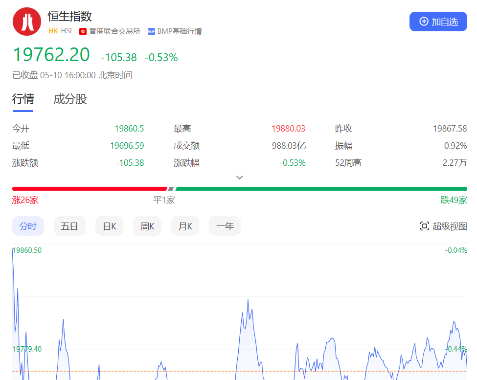 5月9日,港股主要指数收盘下跌。香港恒生指数收跌2.12%,报19867.58点;恒生中国企业指数跌2.36%,报6735.13点;恒生科技指数跌2.95%,报3798.70点。行业板块方面,软件、制药等板块跌幅居前。恒指低开低走,尾盘略有上涨,截至收盘,恒指跌0.53%,报点19777.38。恒生科技指数尾盘拉升,截至收盘涨0.34%,涨3.07%,涨2.75%,快手涨1.8%。