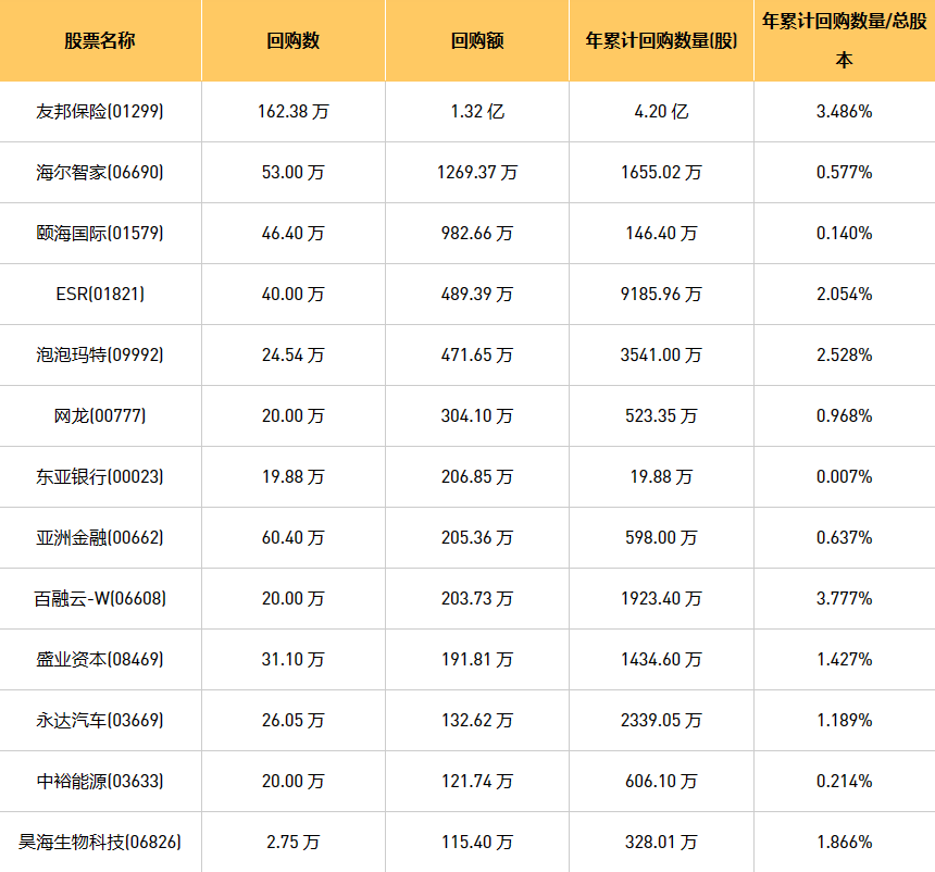 5月12日港股回购概况:天福(06868)、新时代能源(00166)、泡泡玛特(09992)、昊海生物科技(06826)、亚洲金融(00662)、京信通信(02342)、天工国际(00826)、百融云-W(06608)、网龙(00777)、乐声电子(00213)、民银资本(01141)、中裕能源(03633)、盛业资本(08469)、东亚银行(00023)、友邦保险(01299)、阳光纸业(02002)、中远海运国际(00517)、中国心连心化肥(01866)、颐海国际(01579)、海尔智家(06690)、创胜集团-B(06628)、永达汽车(03669)、康圣环球(09960)、现代牙科(03600)、ESR(01821)于2023年5月11日进行了回购。其中,回购金额最大的为友邦保险(01299),回购数量162.38 万,回购金额1.32 亿元。