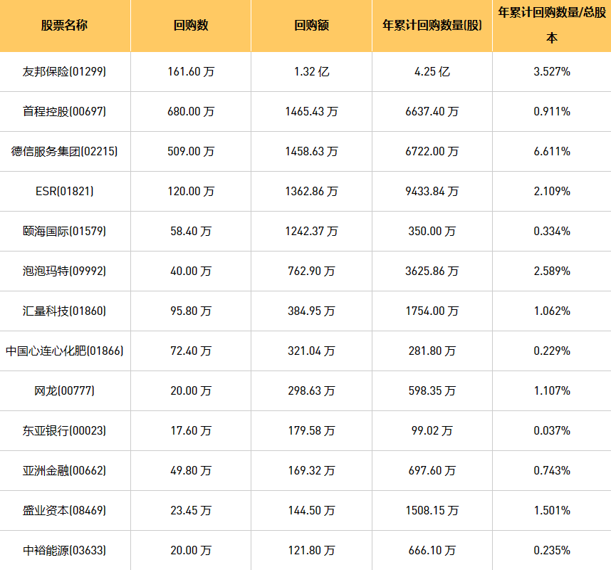 5月17日港股回购概况:和谐汽车(03836)、新时代能源(00166)、天福(06868)、摩比发展(00947)、亚洲金融(00662)、东亚银行(00023)、昊海生物科技(06826)、泡泡玛特(09992)、中国心连心化肥(01866)、天工国际(00826)、首程控股(00697)、京信通信(02342)、中远海运国际(00517)、中裕能源(03633)、现代牙科(03600)、友邦保险(01299)、福森药业(01652)、汇量科技(01860)、盛业资本(08469)、乐声电子(00213)、颐海国际(01579)、网龙(00777)、德信服务集团(02215)、ESR(01821)、康圣环球(09960)于2023年5月16日进行了回购。其中,回购金额最大的为友邦保险(01299),回购数量161.60 万,回购金额1.32 亿元。