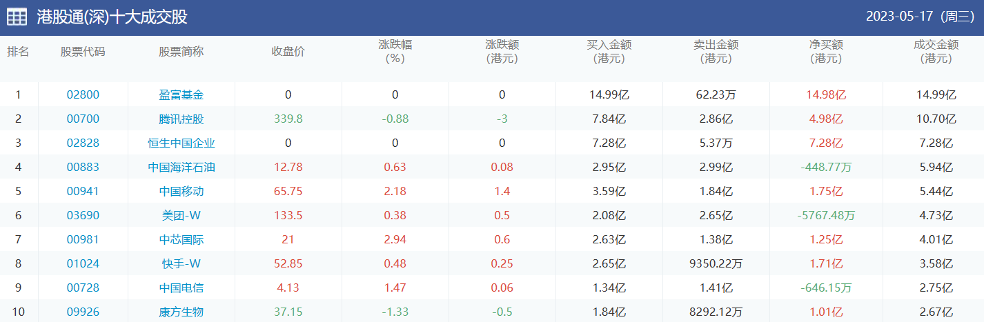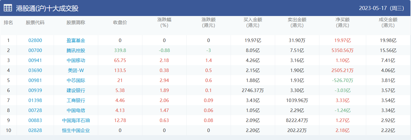 亚汇网实时数据统计:截至5月18日收盘,盈富基金、腾讯控股、中国移动位居港股通(沪)成交前三,盈富基金、腾讯控股、恒生中国企业位居股通(深)成交前三。