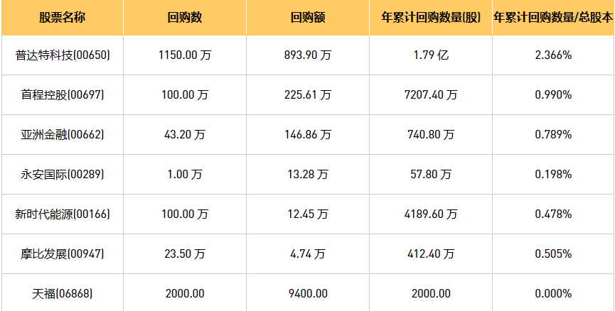 5月19日港股回购概况:永安国际(00289)、亚洲金融(00662)、新时代能源(00166)、摩比发展(00947)、普达特科技(00650)、天福(06868)、首程控股(00697)于2023年5月18日进行了回购。其中,回购金额最大的为普达特科技(00650),回购数量1150.00 万,回购金额893.90 万元。