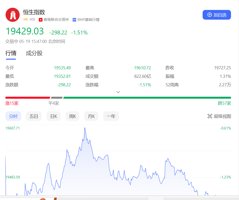 香港恒生指数开盘跌0.97%,早盘恒指快速走低,一度跌近2%,此后全天呈窄幅震荡走势。截至收盘,恒生指数跌1.4%或276.68点,报19450.57点,本周累跌0.9%,全日成交额952.36亿港元;恒生国企指数跌1.81%,报6593.92点;恒生科技指数跌2.43%,报3821.73点。
