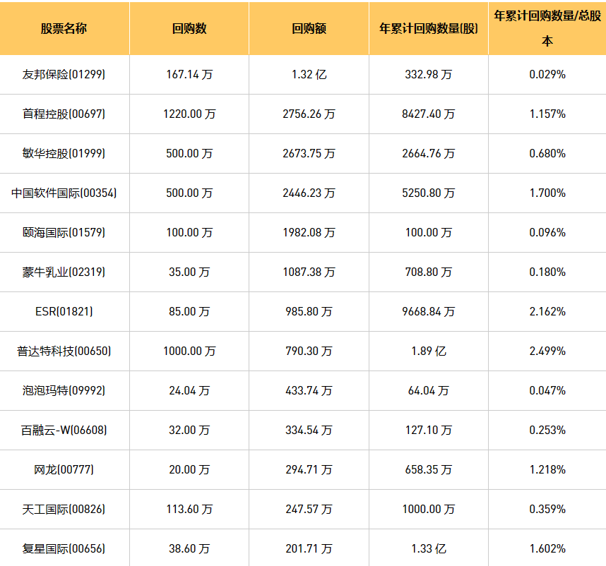 5月22日港股回购概况:天福(06868)、亿胜生物科技(01061)、摩比发展(00947)、永安国际(00289)、首程控股(00697)、东亚银行(00023)、百融云-W(06608)、普达特科技(00650)、蒙牛乳业(02319)、汇量科技(01860)、泡泡玛特(09992)、中国软件国际(00354)、京信通信(02342)、创胜集团-B(06628)、天工国际(00826)、盛业资本(08469)、中裕能源(03633)、中远海运国际(00517)、友邦保险(01299)、新时代能源(00166)、网龙(00777)、乐声电子(00213)、敏华控股(01999)、复星国际(00656)、颐海国际(01579)、康圣环球(09960)、永达汽车(03669)、ESR(01821)于2023年5月19日进行了回购。其中,回购金额最大的为友邦保险(01299),回购数量167.14 万,回购金额1.32 亿元。