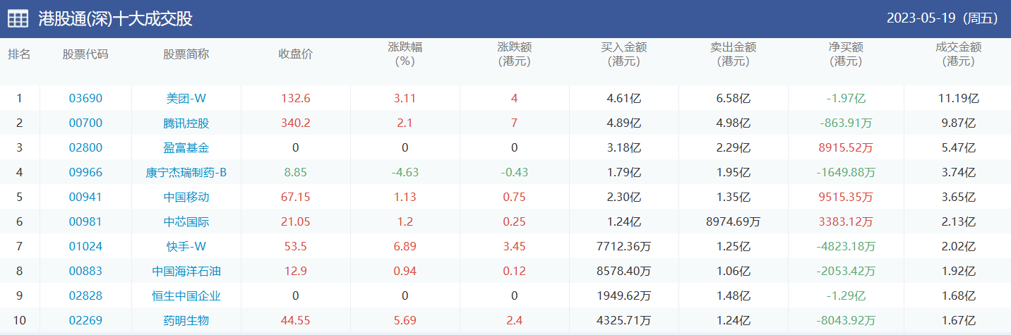 亚汇网实时数据统计:截至5月22日收盘,腾讯控股、盈富基金、美团-w位居港股通(沪)成交前三,美团-w、腾讯控股、盈富基金位居股通(深)成交前三。