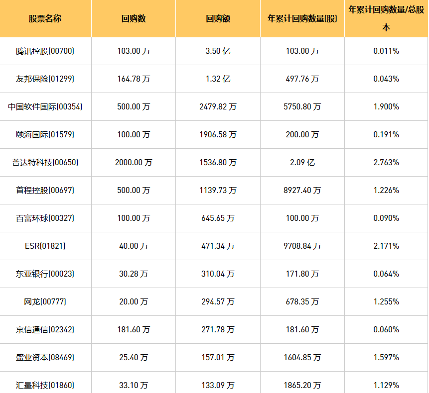 5月23日港股回购概况:普达特科技(00650)、亿胜生物科技(01061)、摩比发展(00947)、亚洲金融(00662)、首程控股(00697)、天福(06868)、东亚银行(00023)、新时代能源(00166)、汇量科技(01860)、网龙(00777)、友邦保险(01299)、百富环球(00327)、腾讯控股(00700)、赛晶科技(00580)、乐声电子(00213)、恒泰裕集团(08081)、中远海运国际(00517)、盛业资本(08469)、中国软件国际(00354)、京信通信(02342)、颐海国际(01579)、康圣环球(09960)、ESR(01821)于2023年5月22日进行了回购。其中,回购金额最大的为腾讯控股(00700),回购数量103.00 万,回购金额3.50 亿元。