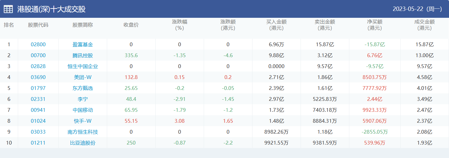 亚汇网实时数据统计:截至5月23日收盘,盈富基金、腾讯控股、恒生中国企业位居港股通(沪)成交前三,美团-w、腾讯控股、盈富基金位居股通(深)成交前三。