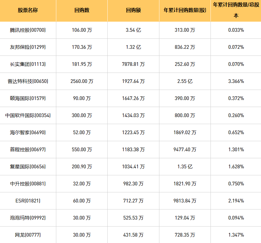 5月25日港股回购概况:亿胜生物科技(01061)、首程控股(00697)、天福(06868)、中国软件国际(00354)、泡泡玛特(09992)、摩比发展(00947)、网龙(00777)、普达特科技(00650)、腾讯控股(00700)、清科创业(01945)、东亚银行(00023)、新时代能源(00166)、新鸿基公司(00086)、恒泰裕集团(08081)、长实集团(01113)、复星国际(00656)、友邦保险(01299)、汇量科技(01860)、中远海运国际(00517)、颐海国际(01579)、永达汽车(03669)、创胜集团-B(06628)、海尔智家(06690)、乐声电子(00213)、康圣环球(09960)、中升控股(00881)、ESR(01821)于2023年5月24日进行了回购。其中,回购金额最大的为腾讯控股(00700),回购数量106.00 万,回购金额3.54 亿元。