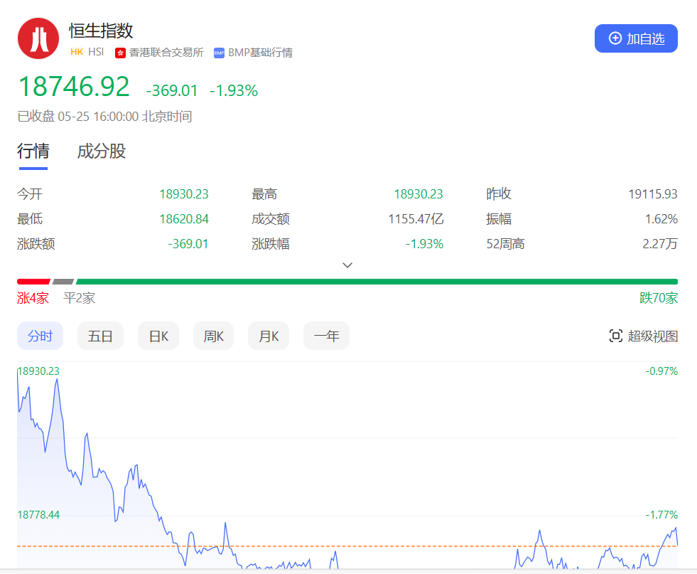 香港恒生指数开盘跌0.97%,早盘恒指低开后持续下挫,午后一度跌近490点,尾盘跌幅则略微收窄。截至收盘,恒生指数跌1.93%或369.01点,创去年12月以来新低,报18746.92点,本周累跌3.62%,全日成交额1155.47亿港元;恒生国企指数跌2.23%,报6333.63点;恒生科技指数跌2.25%,报3691.16点。