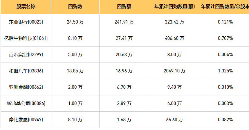 5月30日港股回购概况:亿胜生物科技(01061)、亚洲金融(00662)、摩比发展(00947)、百宏实业(02299)、和谐汽车(03836)、新鸿基公司(00086)、东亚银行(00023)于2023年5月29日进行了回购。其中,回购金额最大的为东亚银行(00023),回购数量24.50 万,回购金额241.91 万元。