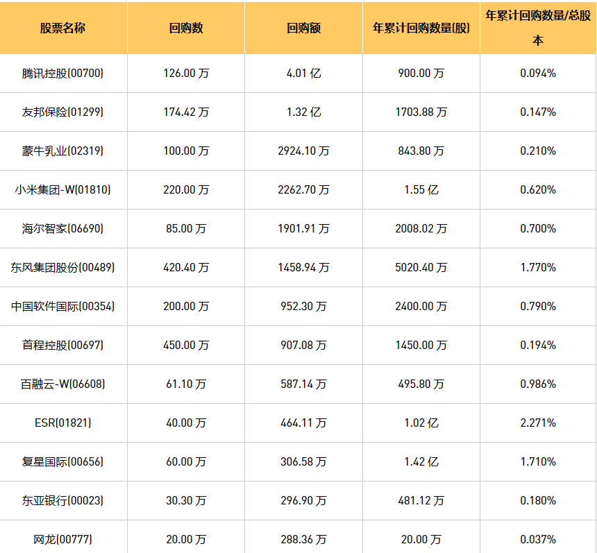 6月2日港股回购概况:首程控股(00697)、中国软件国际(00354)、东亚银行(00023)、天福(06868)、东风集团股份(00489)、和谐汽车(03836)、新时代能源(00166)、清科创业(01945)、腾讯控股(00700)、蒙牛乳业(02319)、友邦保险(01299)、百融云-W(06608)、中远海运国际(00517)、网龙(00777)、创胜集团-B(06628)、复星国际(00656)、小米集团-W(01810)、汇量科技(01860)、同道猎聘(06100)、ESR(01821)、永达汽车(03669)、圣诺医药-B(02257)、康圣环球(09960)、海尔智家(06690)、建业新生活(09983)、福森药业(01652)于2023年6月1日进行了回购。其中,回购金额最大的为腾讯控股(00700),回购数量126.00 万,回购金额4.01 亿元。