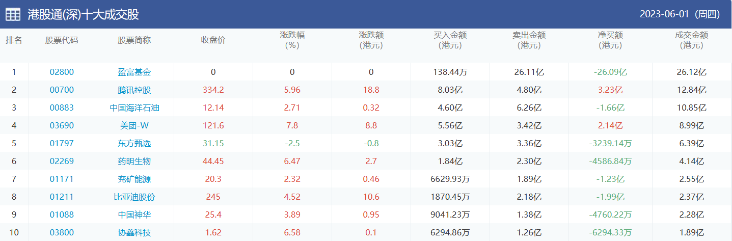 亚汇网实时数据统计:截至6月5日收盘,盈富基金、腾讯控股、中国海洋石油位居港股通(沪)成交前三,盈富基金、腾讯控股、中国海洋石油位居股通(深)成交前三。