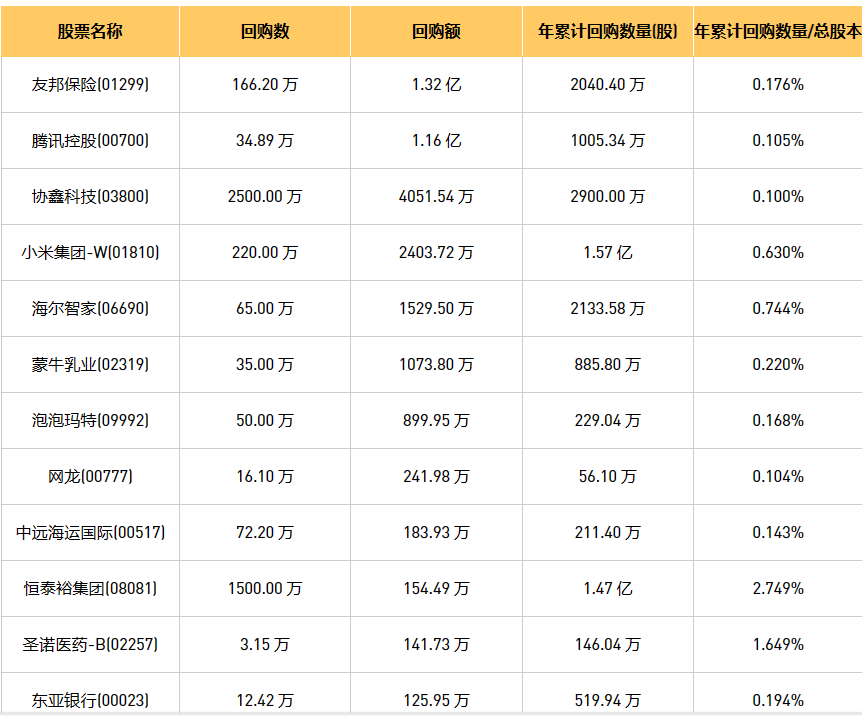 6月6日港股回购概况:蒙牛乳业(02319)、朗生医药(00503)、清科创业(01945)、恒泰裕集团(08081)、同道猎聘(06100)、天福(06868)、东风集团股份(00489)、友邦保险(01299)、东亚银行(00023)、新时代能源(00166)、泡泡玛特(09992)、中远海运国际(00517)、腾讯控股(00700)、创胜集团-B(06628)、小米集团-W(01810)、汇量科技(01860)、海尔智家(06690)、网龙(00777)、康圣环球(09960)、圣诺医药-B(02257)、协鑫科技(03800)、福森药业(01652)于2023年6月5日进行了回购。其中,回购金额最大的为友邦保险(01299),回购数量166.20 万,回购金额1.32 亿元。