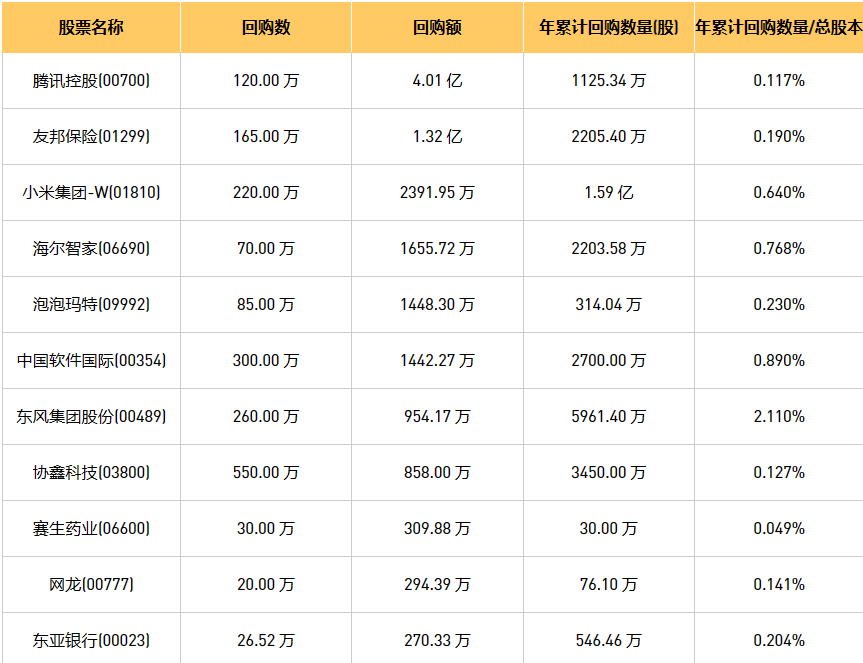 6月7日港股回购概况:恒泰裕集团(08081)、天福(06868)、亚洲金融(00662)、东亚银行(00023)、摩比发展(00947)、百宏实业(02299)、泡泡玛特(09992)、东风集团股份(00489)、清科创业(01945)、新时代能源(00166)、友邦保险(01299)、腾讯控股(00700)、网龙(00777)、同道猎聘(06100)、创胜集团-B(06628)、中国心连心化肥(01866)、汇量科技(01860)、中国软件国际(00354)、小米集团-W(01810)、圣诺医药-B(02257)、康圣环球(09960)、海尔智家(06690)、赛生药业(06600)、协鑫科技(03800)于2023年6月6日进行了回购。其中,回购金额最大的为腾讯控股(00700),回购数量120.00 万,回购金额4.01 亿元。