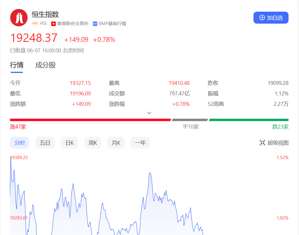 香港恒生指数开盘涨1.19%,早盘恒指高开后小幅下跌,此后全天呈高位震荡走势。截至收盘,恒生指数涨0.8%或152.72点,报19252点,全日成交额867.24亿港元;恒生国企指数涨0.95%,报6541.16点;恒生科技指数涨2.26%,报3921.02点。
