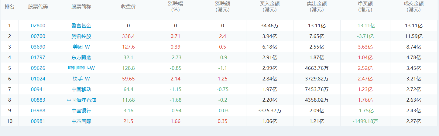 亚汇网6月12日港股通数据统计显示:美团-w净买入额居首,达6.18亿港元,盈富基金净卖出额居第一位。(亚汇网编辑:静香)