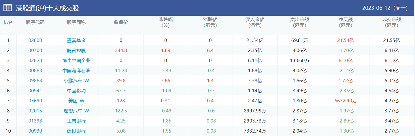 亚汇网实时数据统计:截至6月13日收盘,盈富基金、腾讯控股、恒生中国企业位居港股通(沪)成交前三,盈富基金、腾讯控股、美团-w位居股通(深)成交前三。